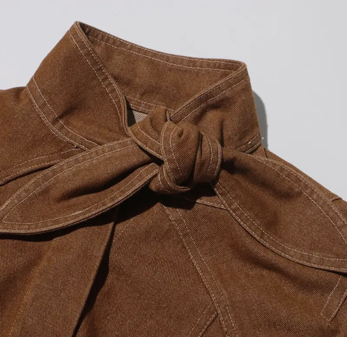 - Top: Cropped silhouette with sculpted seams, buttoned cuffs, and an elegant tie-neck detail that adds a feminine twist to utility style.