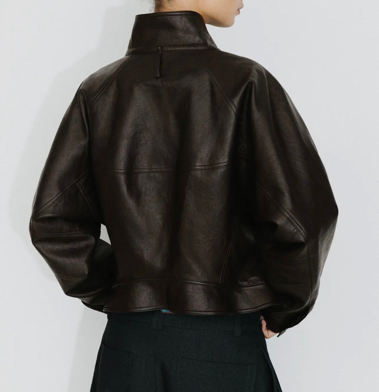 Elevate your outerwear with this statement curved sleeve faux leather jacket in rich brown. Designed with a bold, structured silhouette, it features a stand collar, oversized batwing sleeves, and a flattering cinched waist with sculpted hem. The curved cut creates a three-dimensional shape that combines both edge and elegance, making it a versatile piece for layering.