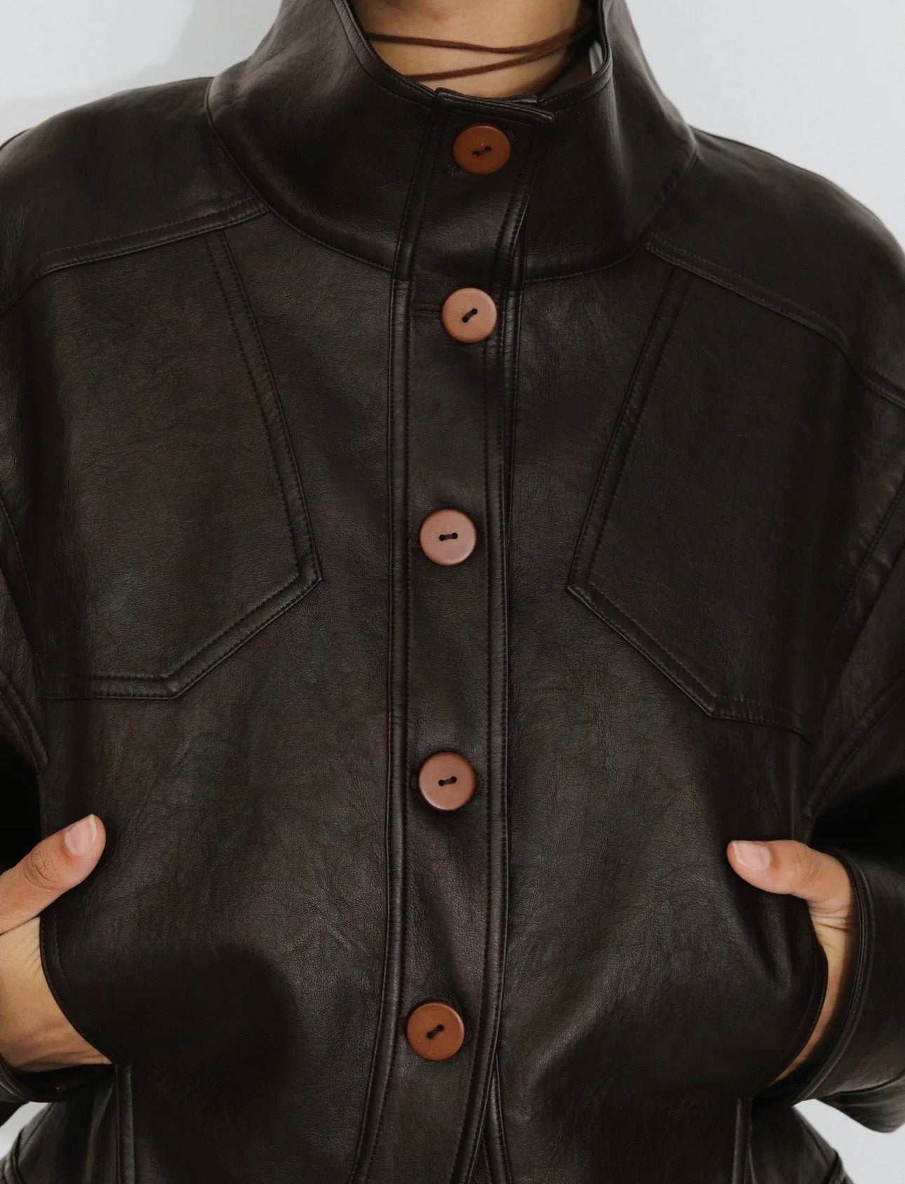 Curved Sleeve Faux Leather Jacket – Brown