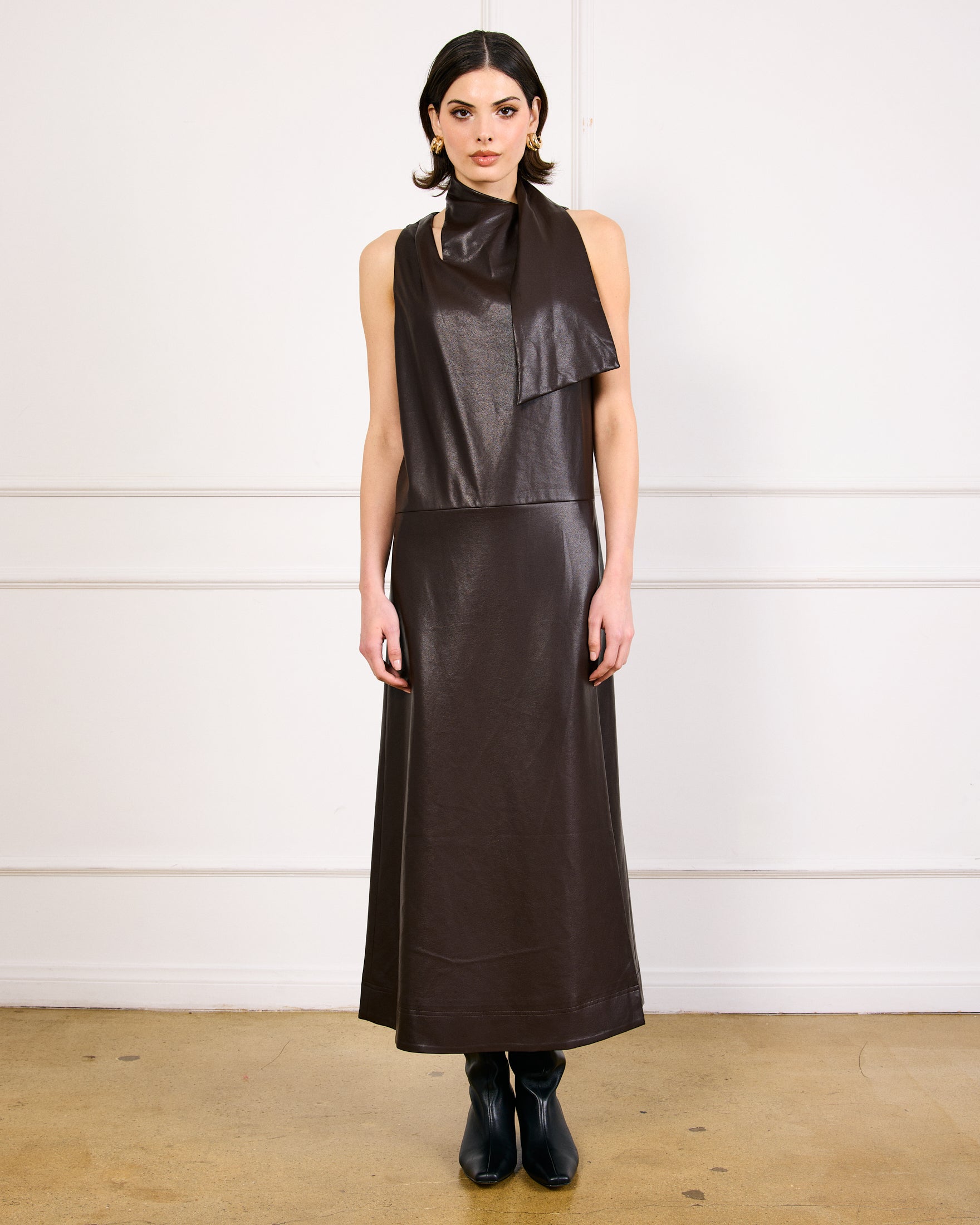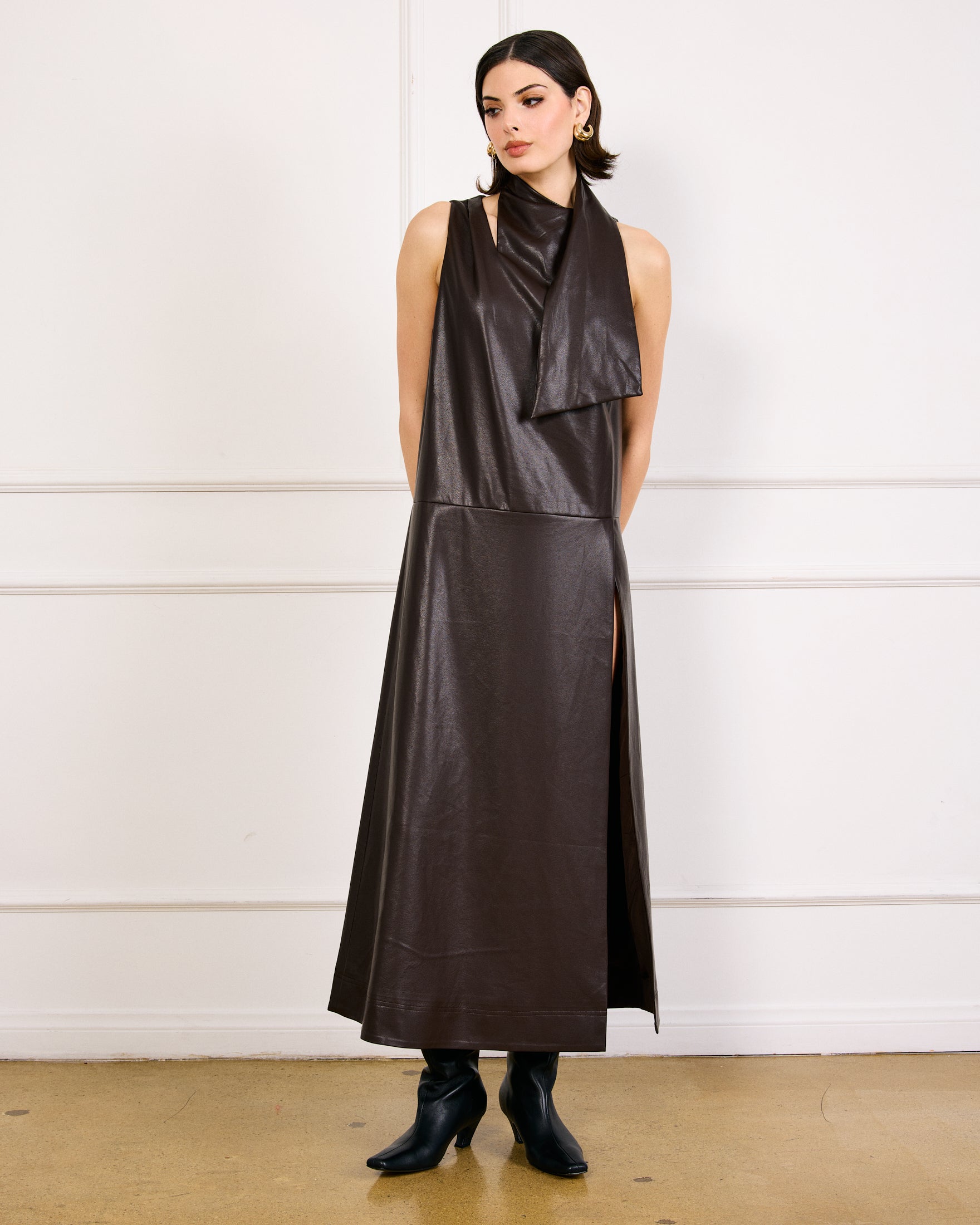 Meet The Maddox Luxe Faux Leather Maxi—a striking blend of modern edge and quiet elegance. Crafted in a rich chocolate faux leather, this sleeveless silhouette drapes effortlessly for a sleek, elongated look. The built-in scarf neckline adds high-fashion drama, while the fluid A-line skirt delivers graceful movement with every step.