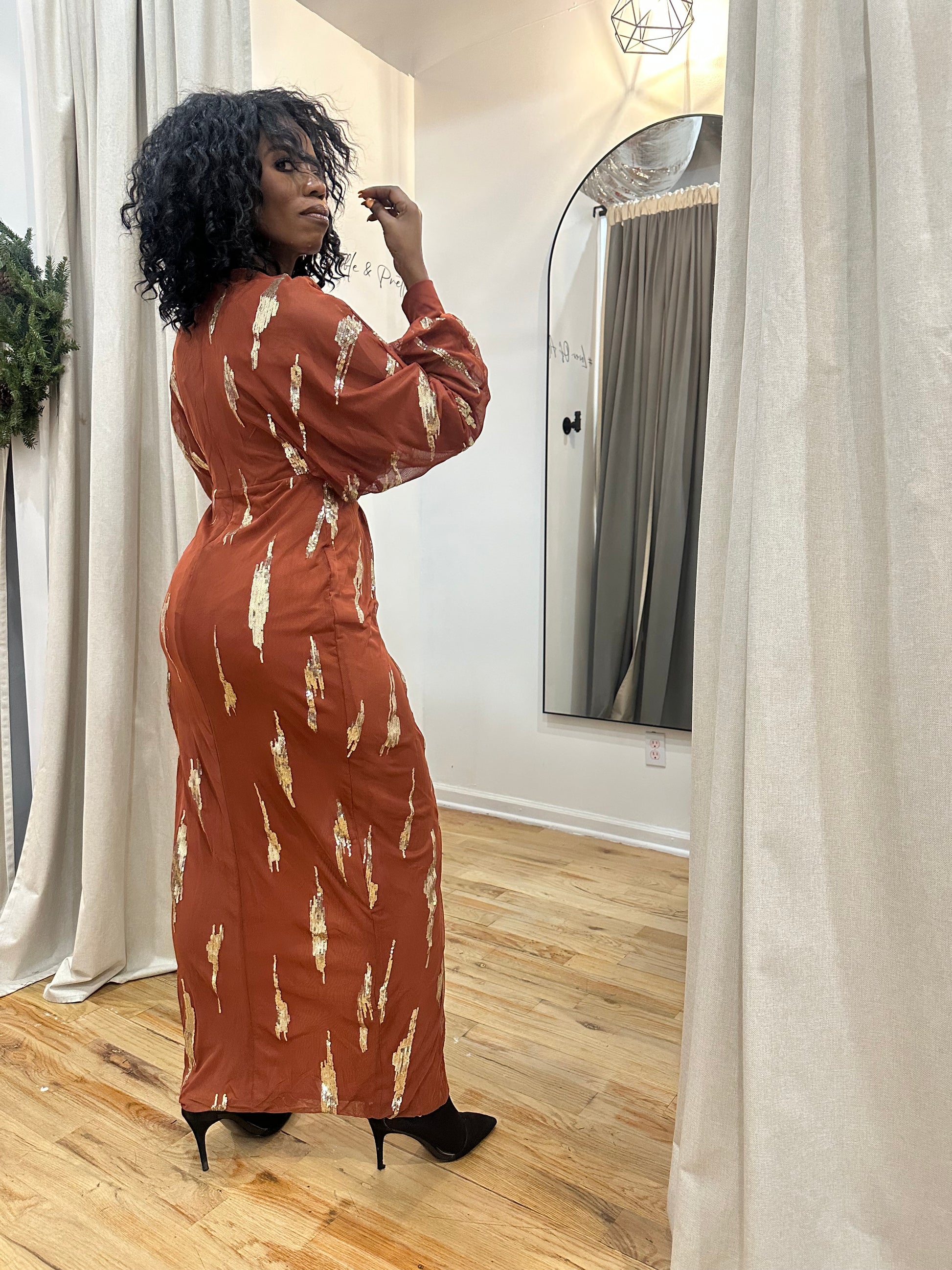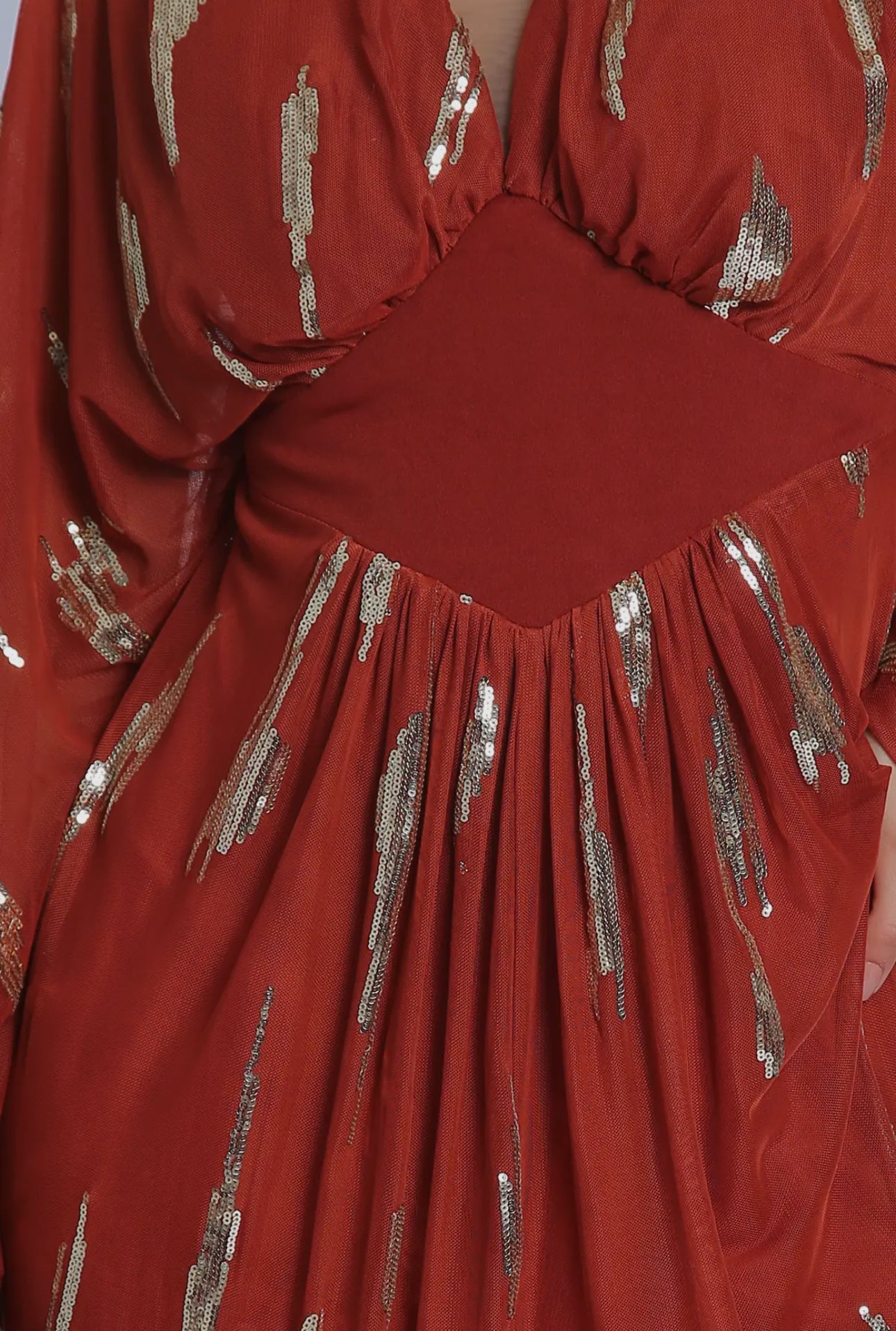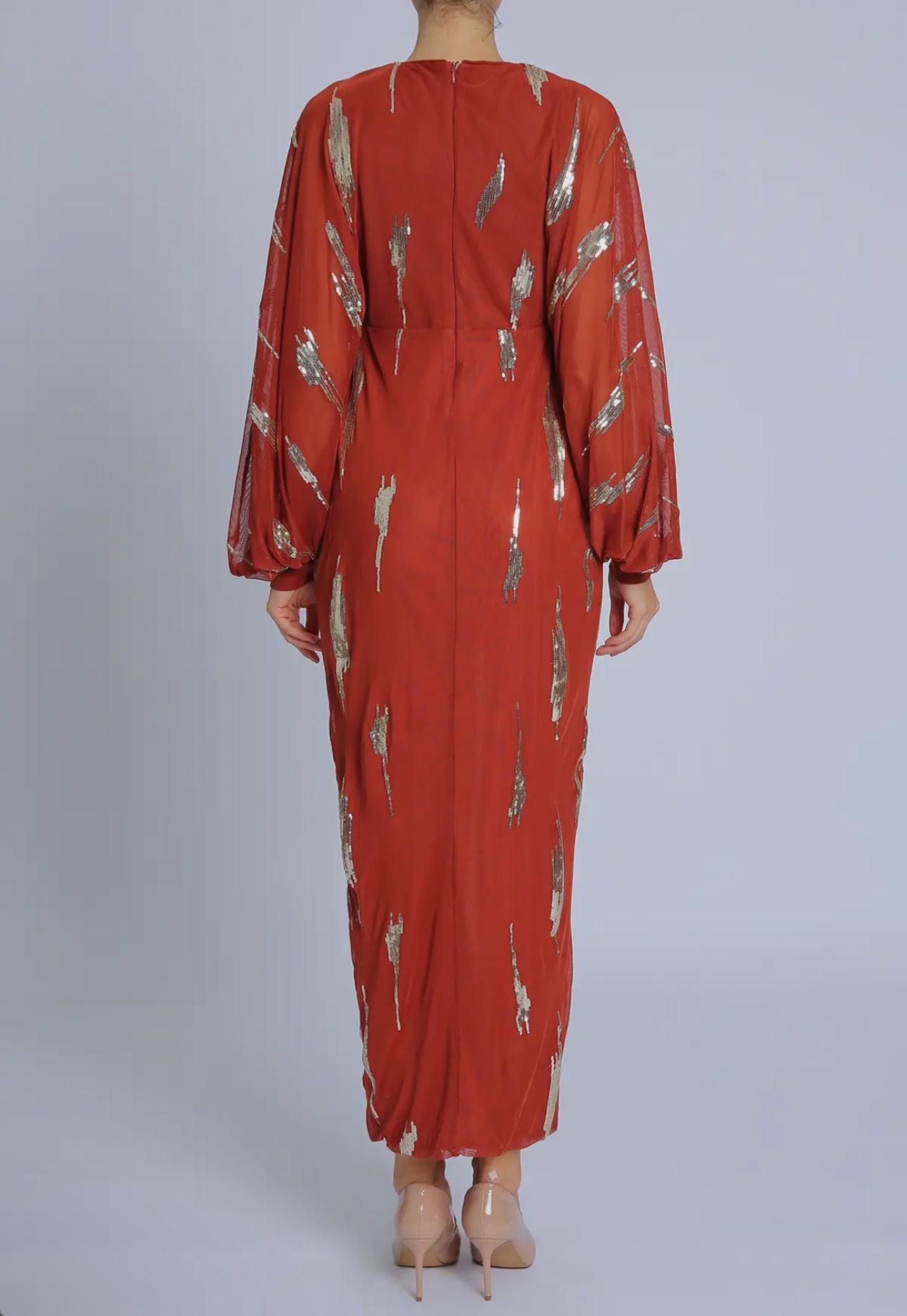 Sequined Detail V-Neck Slit Sheer Maxi Dress
