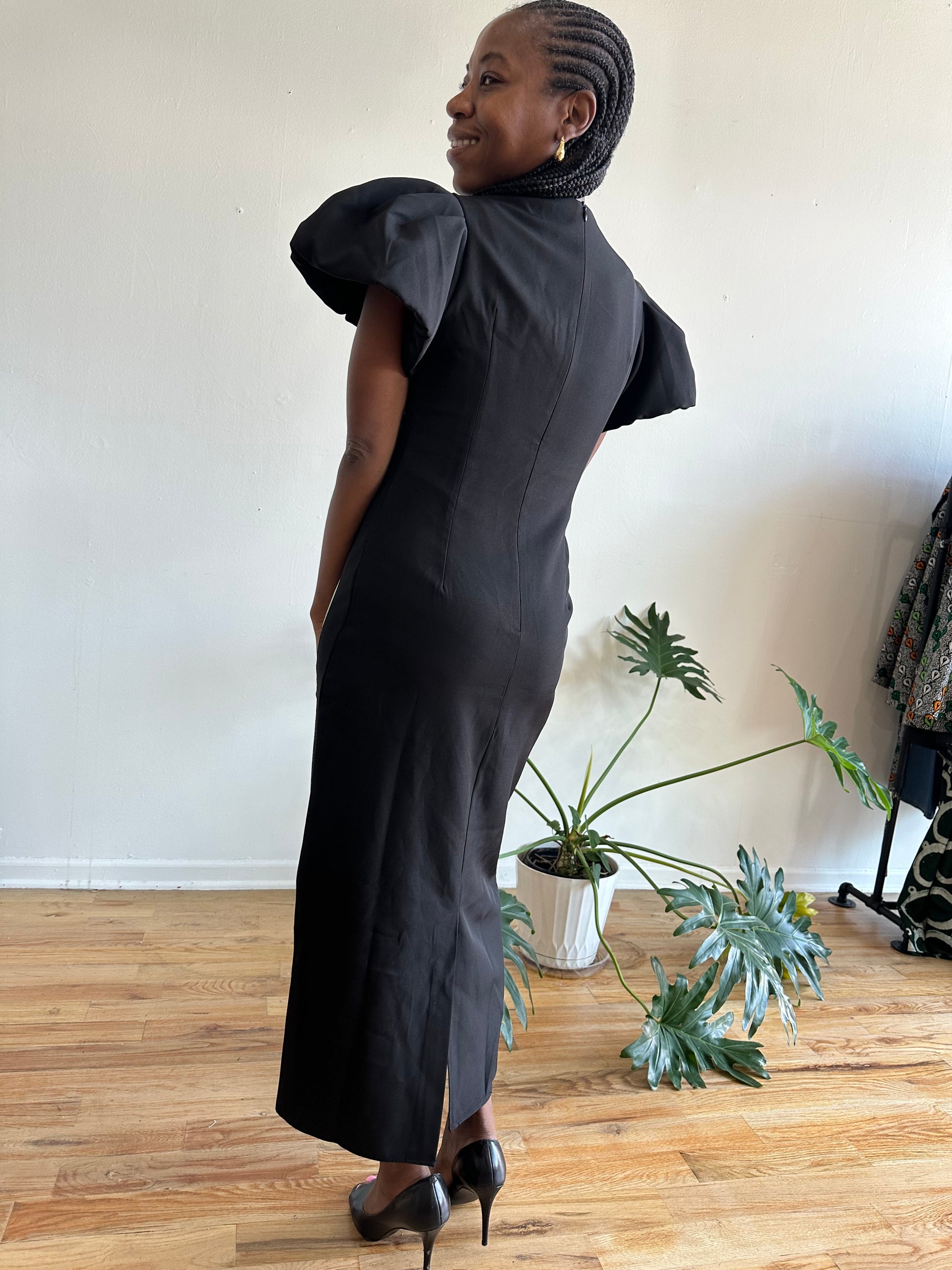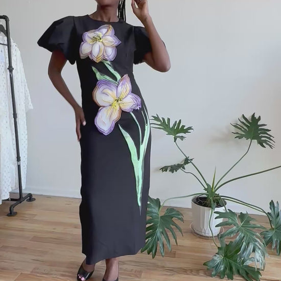 Command the room with effortless elegance in our Iris Majesty Midi Dress—a bold, sophisticated statement piece that blooms with artistic flair. Crafted in a rich black fabric, this stunning dress features dramatic puff sleeves and hand-painted-style floral appliqués in vibrant shades of purple, ivory, and yellow. The elongated iris stem detail draws the eye downward, elongating the silhouette with grace and modern edge.