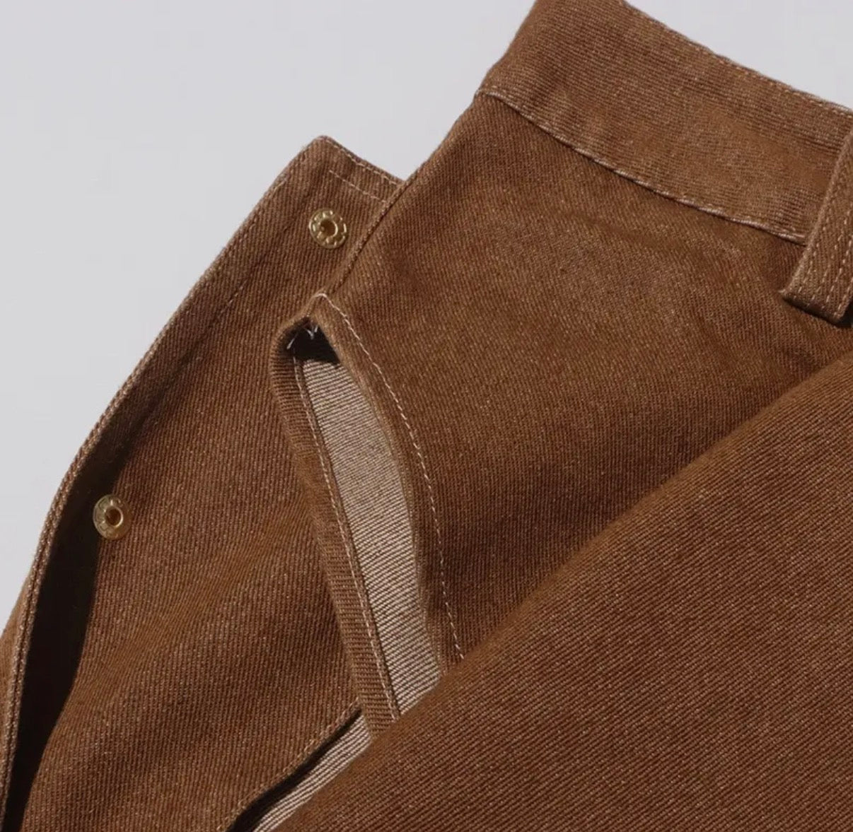 - Fabric: Sturdy denim with contrast stitching that highlights its tailored construction.