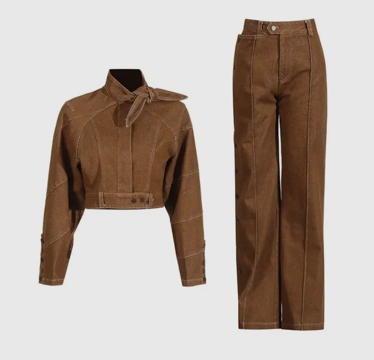 Elevate your everyday denim with this sleek, statement-making two-piece set. Designed in a rich brown wash, the set pairs a structured crop jacket with coordinating straight-leg pants for a look that’s equal parts polished and modern.