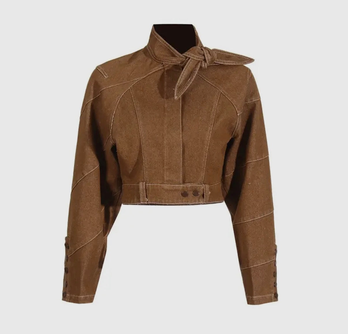 - Top: Cropped silhouette with sculpted seams, buttoned cuffs, and an elegant tie-neck detail that adds a feminine twist to utility style.