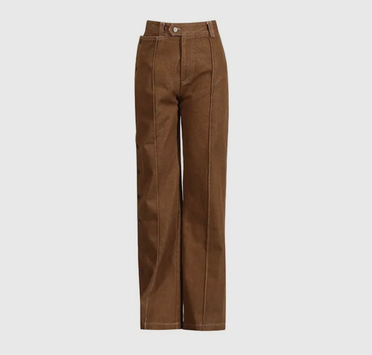 - Pants: High-waisted with a streamlined straight leg and side snap-button accents for a versatile finish.