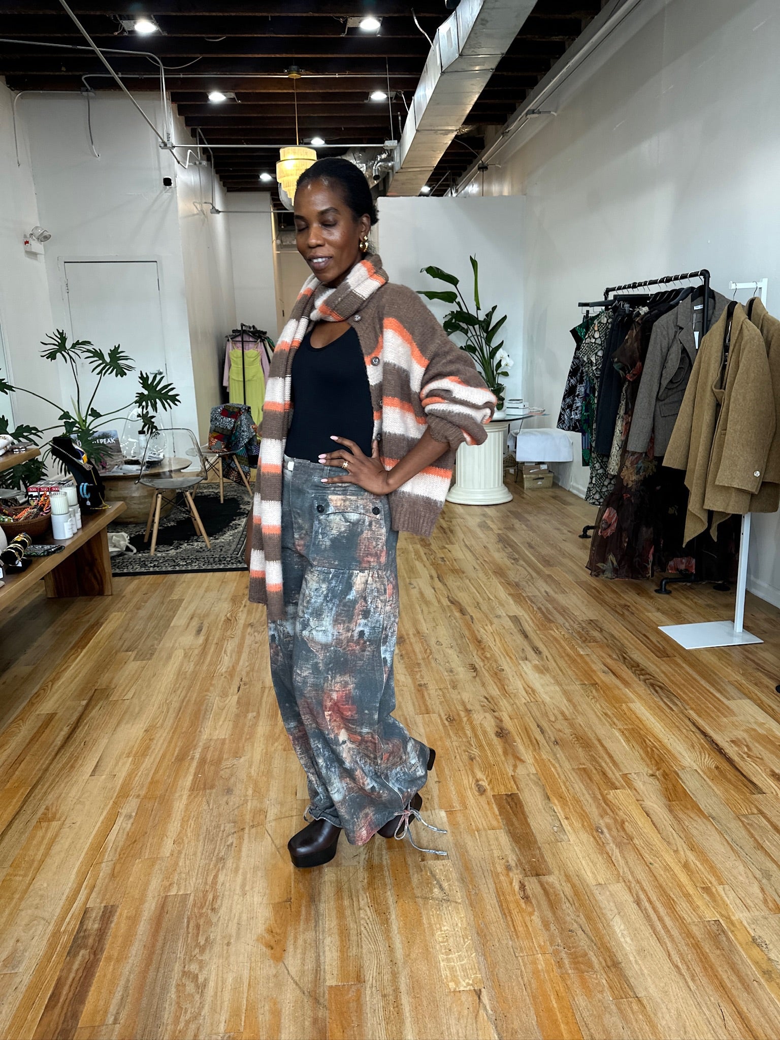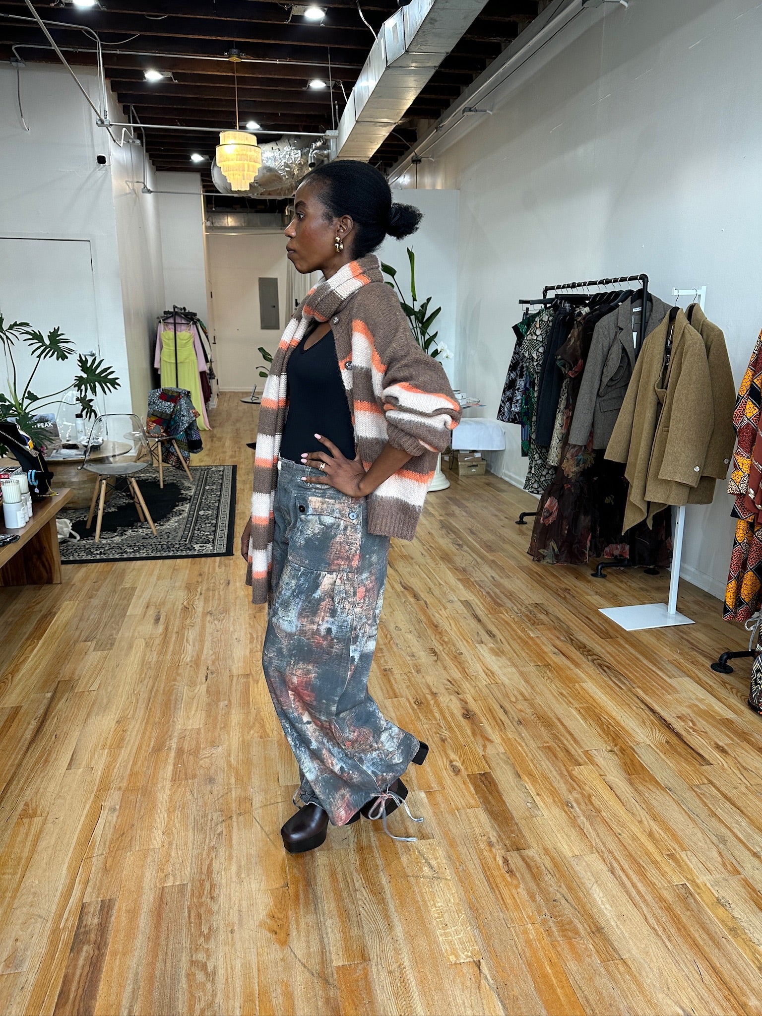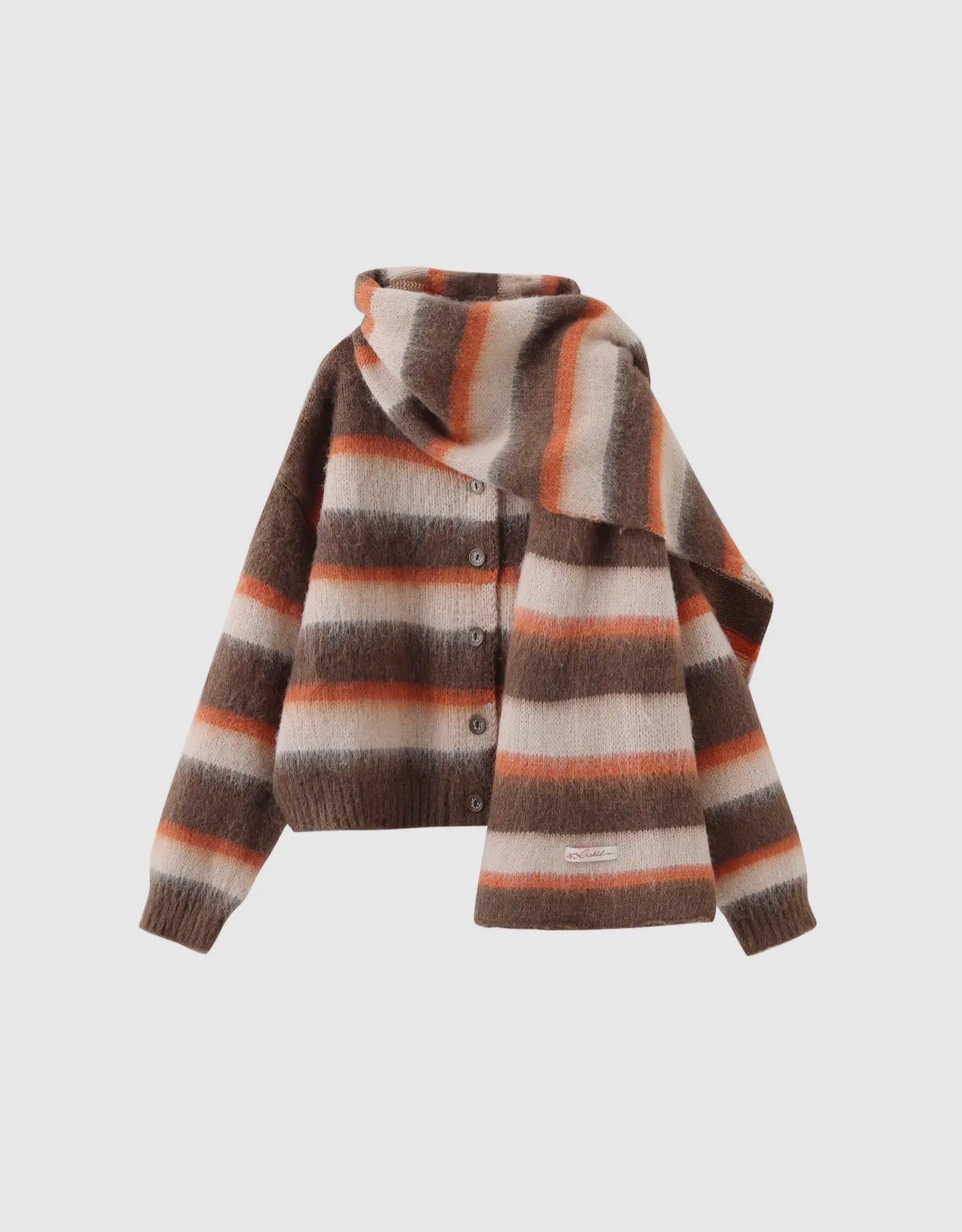 Wrap yourself in cozy chic with this playful two-piece cardigan set. Designed with bold horizontal stripes in earthy brown, soft cream, and a pop of vibrant orange, this look blends comfort and style seamlessly. The set features a relaxed button-front cardigan with an oversized fit, plus a matching scarf that adds an extra layer of warmth and versatility.
