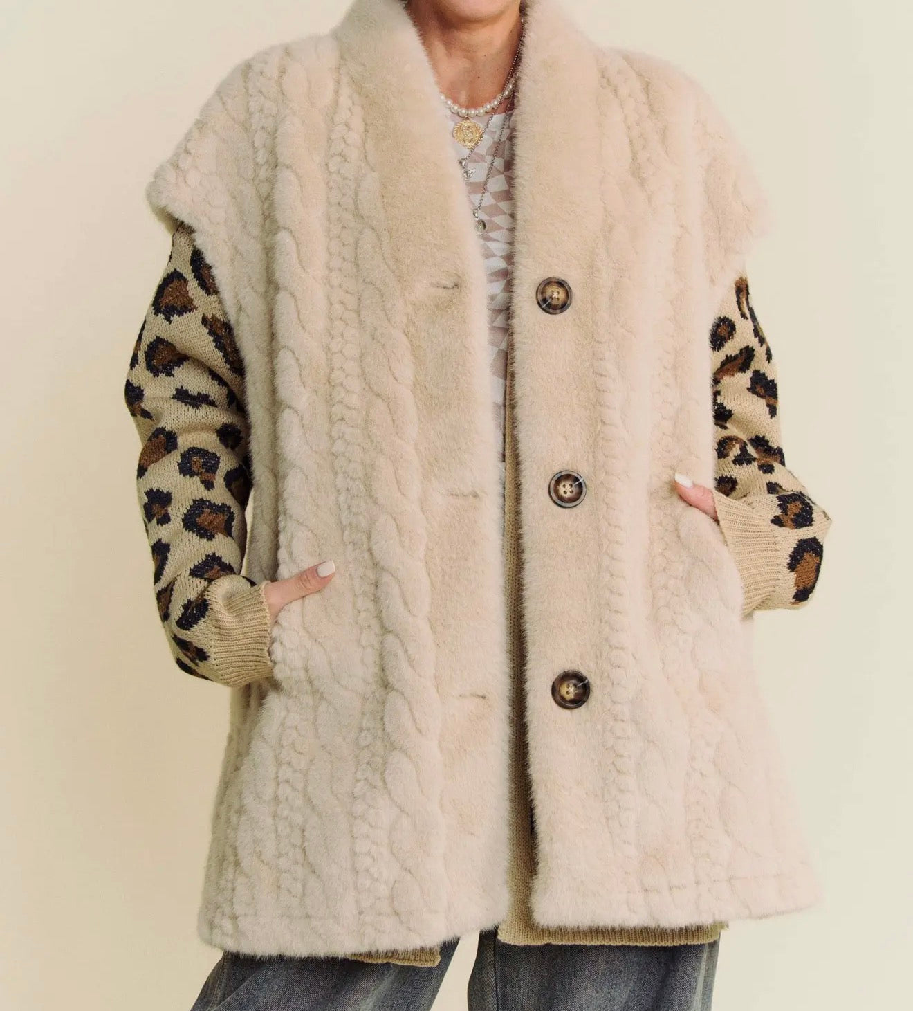 Wrap yourself in elevated comfort with The Luxe Cable Plush Coat, a stunning fusion of faux fur softness and cable-knit inspired texture. Designed for the woman who loves timeless warmth with a modern edge, this coat brings instant sophistication to any look.